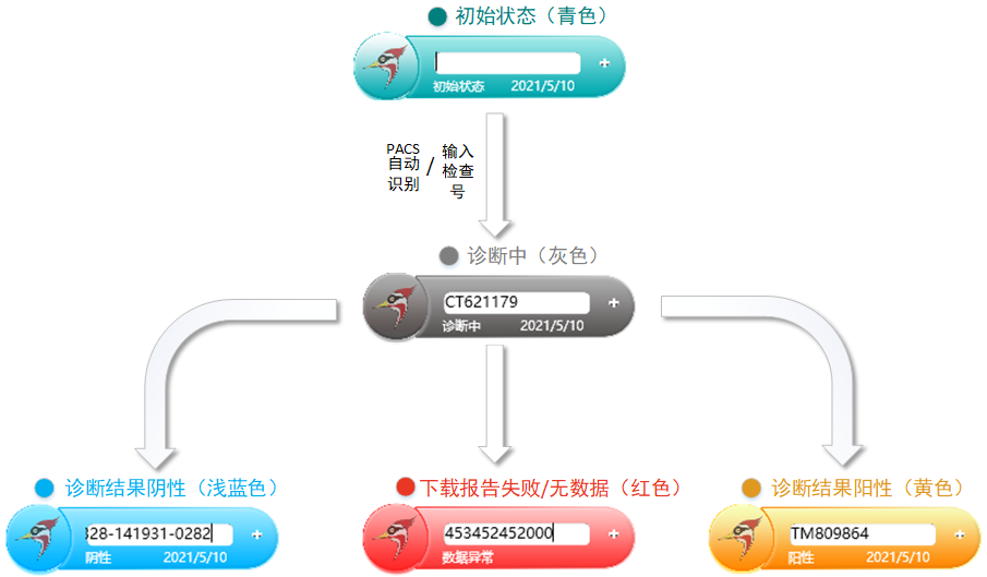 根據(jù)不同的診斷結(jié)果,“小啄”將呈現(xiàn)出不同的顏色,同時,在“小啄”中間的輸入框下方顯示對應(yīng)的文字提示(診斷狀態(tài)、診斷日期),如下圖所示。