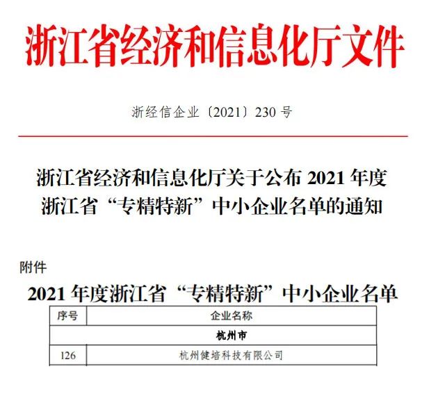 喜訊:健培科技成功入圍2021年度浙江省“專精特新”企業(yè)!