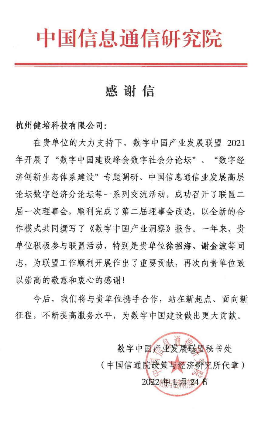 年前上班最后一天,一大早就收到了數(shù)字中國(guó)產(chǎn)業(yè)發(fā)展聯(lián)盟秘書處發(fā)來(lái)的感謝信。這是對(duì)健培科技這一年來(lái)積極投入數(shù)字醫(yī)療創(chuàng)新行動(dòng)的肯定,特別是公司副總裁徐招海、總助謝金波等同事,積極參與聯(lián)盟主持的各項(xiàng)工作,結(jié)合公司數(shù)字醫(yī)療行業(yè),為數(shù)字化改革提供健培科技的一份理解與實(shí)踐。