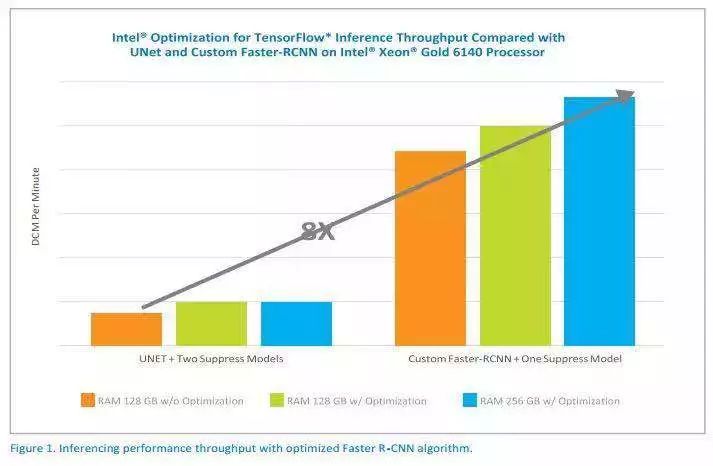 直至去年,健培利用英特爾至強金牌6140處理器以及英特爾對TensorFlow優(yōu)化的核心庫(MKL-DNN),將醫(yī)學影像深度學習性能大大提升,其中,自定義Faster R-CNN的性能整整提高了8倍以上。