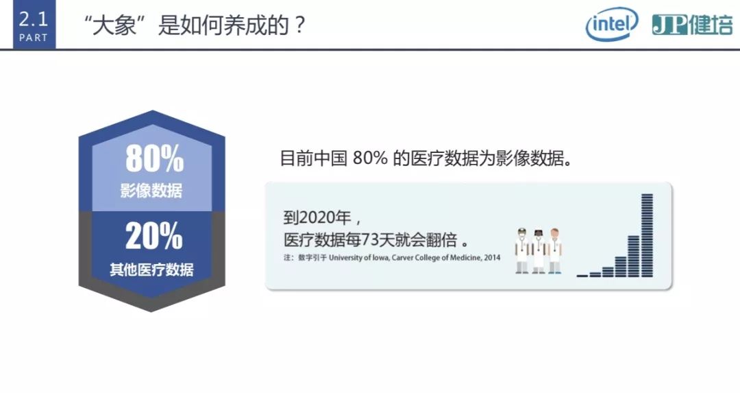 大象即醫(yī)學大數(shù)據(jù),包括電子病歷、影像、心電、病理、基因等大數(shù)據(jù),其中影像數(shù)據(jù)量最大,醫(yī)院存儲數(shù)據(jù)的80%以上來自影像數(shù)據(jù)。