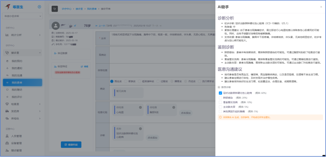 在輔診環(huán)節(jié),啄醫(yī)生醫(yī)療大模型V2.0與DeepSeek強(qiáng)強(qiáng)聯(lián)合,自動識別患者主訴信息,為醫(yī)生提供診斷分析、鑒別診斷和醫(yī)患溝通建議,并生成相關(guān)推薦診斷結(jié)論的概率分析,還能結(jié)合臨床數(shù)據(jù),為醫(yī)生提供全面的輔助診斷建議。無論是復(fù)雜的疾病篩查,還是細(xì)微的病理分析,都能得到精準(zhǔn)支持,提升診斷效率與準(zhǔn)確性。