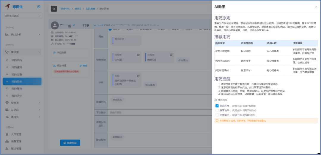 實例:根據(jù)患者患有冠狀動脈粥樣硬化性心臟病,無明顯誘因下出現(xiàn)胸痛、胸骨中下段疼痛,程度一般,伴有咳嗽咳痰、頭暈等癥狀,提示用藥原則應(yīng)以緩解癥狀、改善心肌缺血、降低心肌耗氧量、抗凝、抗血小板聚集為主,推薦用藥列表(阿司匹林、硝苯地平、比索洛爾)和用藥提醒,醫(yī)生只需勾選操作就可以實現(xiàn)開立藥囑。