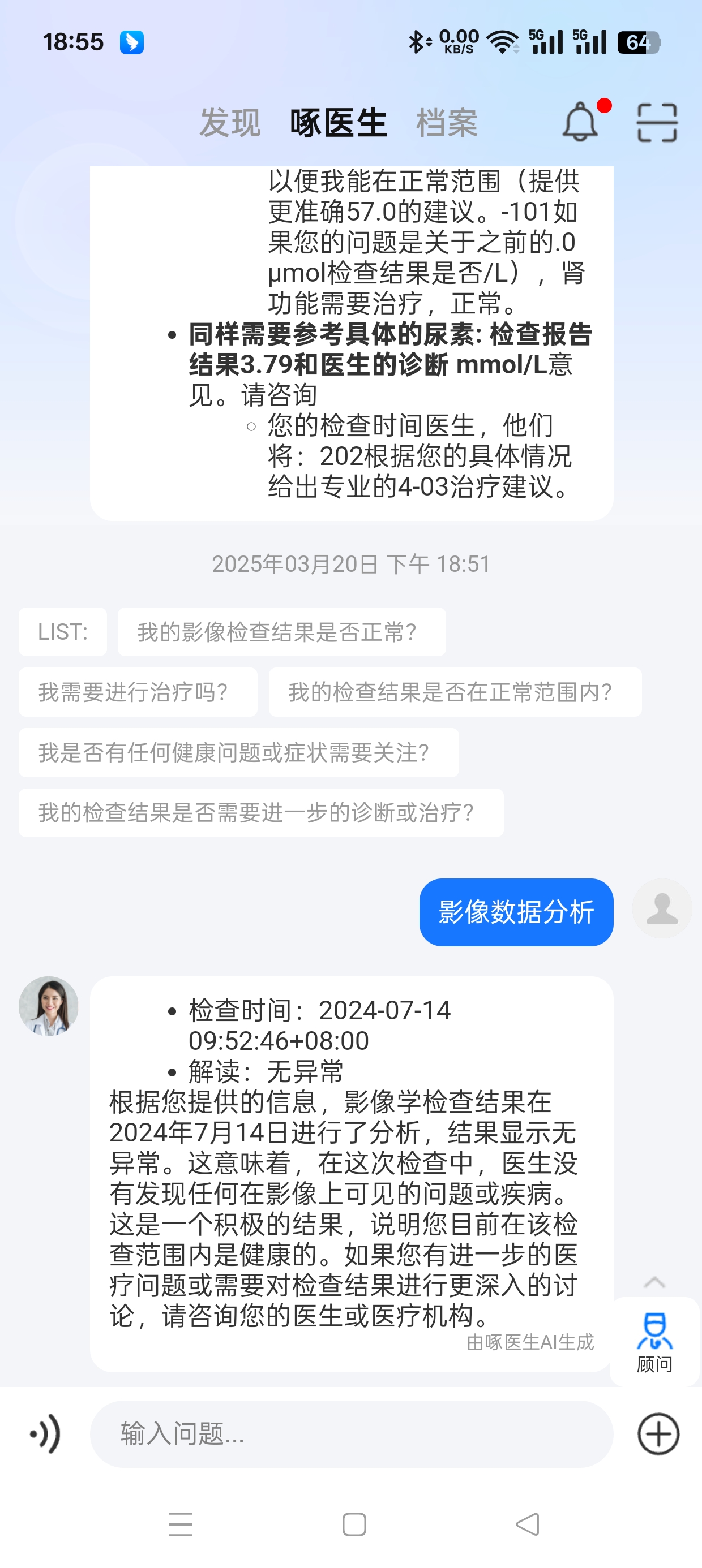 啄醫(yī)生具備患者AI智能咨詢功能。患者如果對(duì)報(bào)告產(chǎn)生疑惑,便可進(jìn)行對(duì)話咨詢。能結(jié)合患者當(dāng)前影像報(bào)告,患者再口語(yǔ)化描述其他體感癥狀,幫助患者分析自身病情,可以引導(dǎo)完成必要復(fù)查隨訪,讓患者輕松理解。就像和一位貼心的醫(yī)生朋友聊天一樣自然,為患者帶來(lái)了全新的就醫(yī)體驗(yàn),極大地提升了患者的就醫(yī)主動(dòng)性和健康管理意識(shí)。