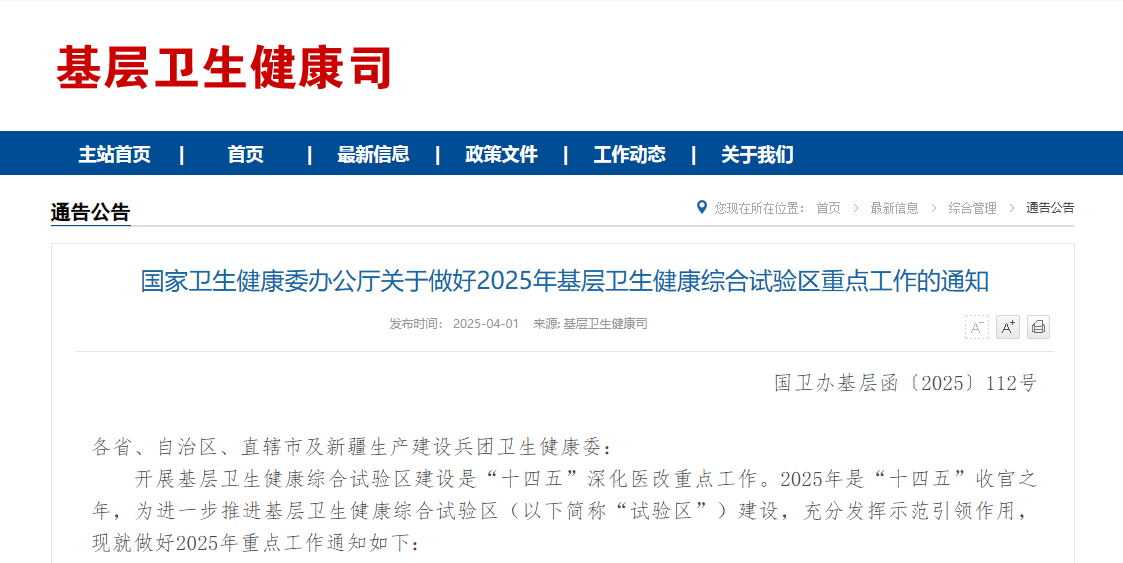 2025年4月1日,國(guó)家衛(wèi)生健康委辦公廳發(fā)布了《關(guān)于做好2025年基層衛(wèi)生健康綜合試驗(yàn)區(qū)重點(diǎn)工作的通知》。這不是普通的政策通知,而是以“深化醫(yī)改攻堅(jiān)年”為旗號(hào),掀起基層衛(wèi)生健康服務(wù)能力“跨越式革命”的行動(dòng)指南。作為“十四五”規(guī)劃的收官之年,這份文件不僅將試驗(yàn)區(qū)建設(shè)納入國(guó)家衛(wèi)健委領(lǐng)導(dǎo)的重點(diǎn)聯(lián)系省份工作,還拋出了十大顛覆性任務(wù),直指基層醫(yī)療的“痛點(diǎn)”和“未來(lái)”。