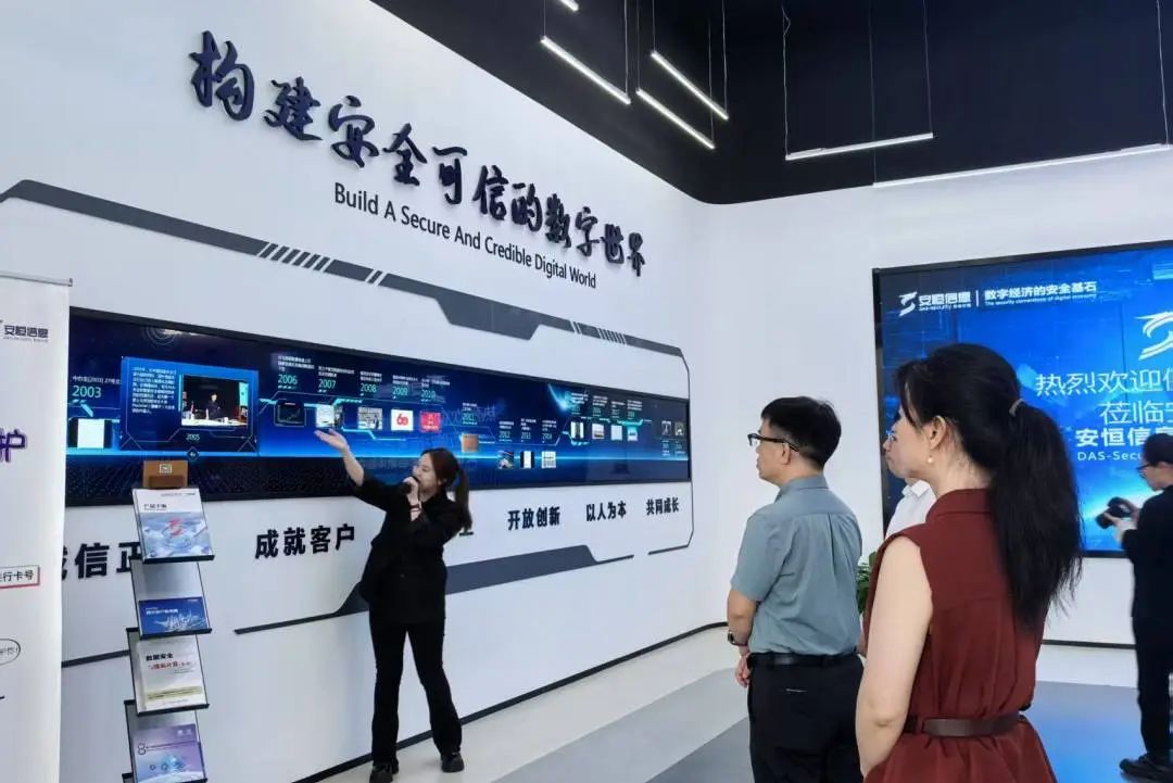 健培科技領(lǐng)導(dǎo)一行參觀了安恒信息安全創(chuàng)新體驗中心,詳細了解安恒信息的主營業(yè)務(wù)范圍、已取得的成果、企業(yè)文化建設(shè)等情況。展廳集中展示了安恒信息在網(wǎng)絡(luò)安全、數(shù)據(jù)安全、云安全、物聯(lián)網(wǎng)安全等領(lǐng)域的前沿技術(shù)與創(chuàng)新成果。