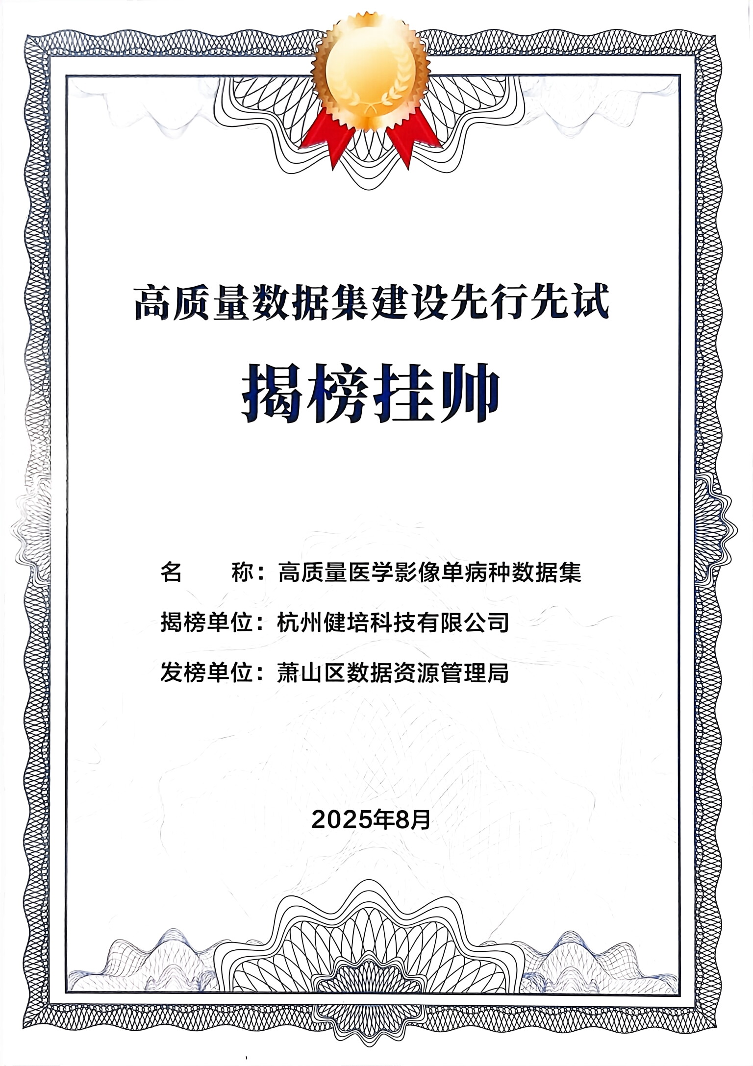 據(jù)悉,本次評(píng)選是為貫徹落實(shí)國(guó)務(wù)院和省市區(qū)政府“人工智能+應(yīng)用”行動(dòng)的工作部署,由浙江省市數(shù)據(jù)局指導(dǎo)、蕭山區(qū)數(shù)據(jù)局開(kāi)展的蕭山區(qū)高質(zhì)量數(shù)據(jù)集建設(shè)征集培育工作。在公開(kāi)征集和各單位推薦上報(bào)基礎(chǔ)上,經(jīng)行業(yè)專家評(píng)審篩選,并征求經(jīng)信、發(fā)改、科技等部門(mén)意見(jiàn)后,最終形成首批40個(gè)高質(zhì)量數(shù)據(jù)集建設(shè)先行先試揭榜掛帥名單。與健培科技一同上榜的還有萬(wàn)向集團(tuán)、傳化物流集團(tuán)、浙江移動(dòng)等單位。