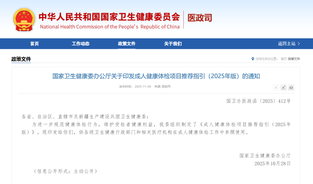 11月4日,國家衛(wèi)健委發(fā)布了《成人健康體檢項目推薦指引(2025年版)》,旨在為進一步規(guī)范健康體檢行為,維護受檢者健康權(quán)益,促進健康體檢事業(yè)發(fā)展。