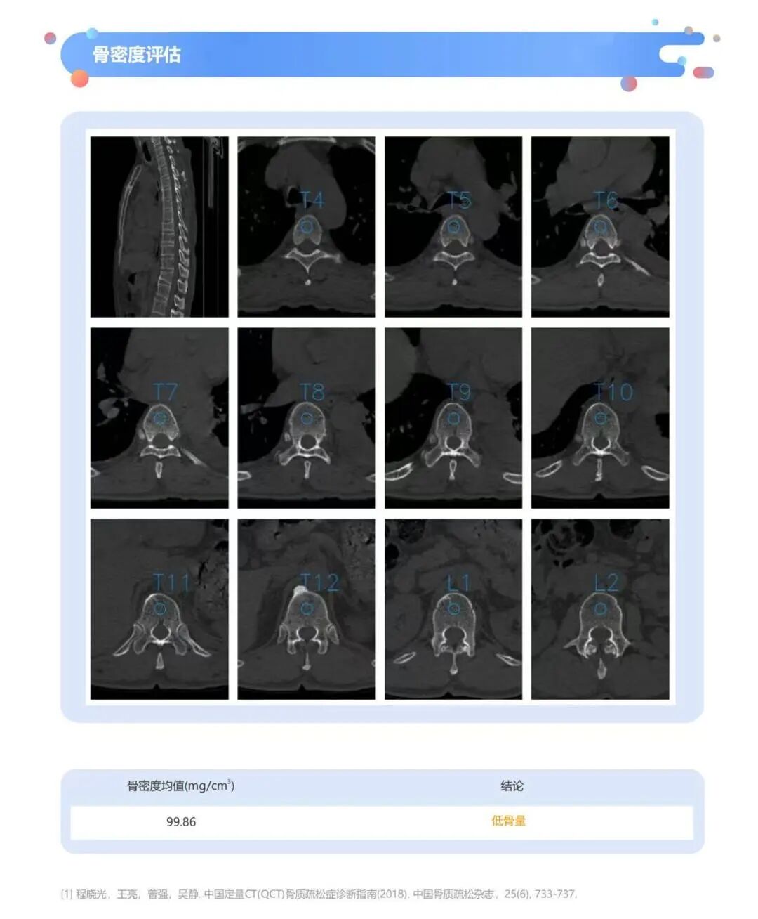 2025 年版《成人健康體檢項目推薦指引》明確:40 歲以上人群常規(guī)體檢新增骨密度檢測項目,體脂率、肌肉脂肪分布情況也納入檢查,且定量 CT(QCT)被列為骨密度檢測優(yōu)先推薦。 健培啄醫(yī)生胸部CT一檢多篩無需額外掃描,依托常規(guī) CT 影像即可完成骨密度檢測,實現(xiàn) “篩 - 診 - 評” 一體化,為 40 + 人群骨健康管理及骨質(zhì)疏松等慢性病風(fēng)險評估,提供高效、精準(zhǔn)的技術(shù)支持,助力落實科學(xué)健康篩查。