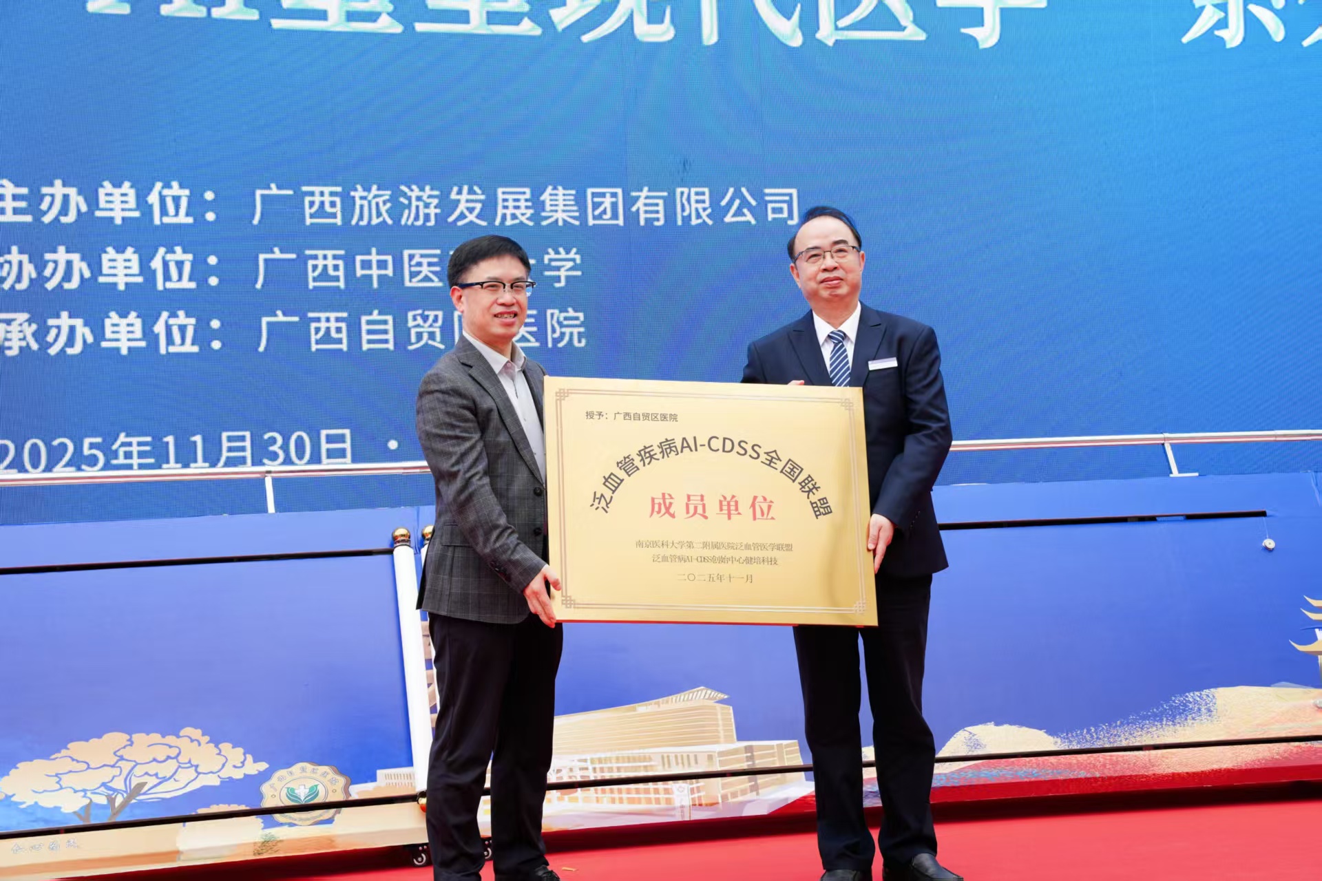 會(huì)上,舉辦了“泛血管疾病AI-CDSS全國(guó)聯(lián)盟成員單位”授牌儀式。聯(lián)盟單位發(fā)起人程國(guó)華教授向廣西自貿(mào)區(qū)醫(yī)院黨委副書(shū)記、院長(zhǎng)黃貴華授牌。授予廣西自貿(mào)區(qū)醫(yī)院泛血管疾病AI-CDSS全國(guó)聯(lián)盟成員單位。